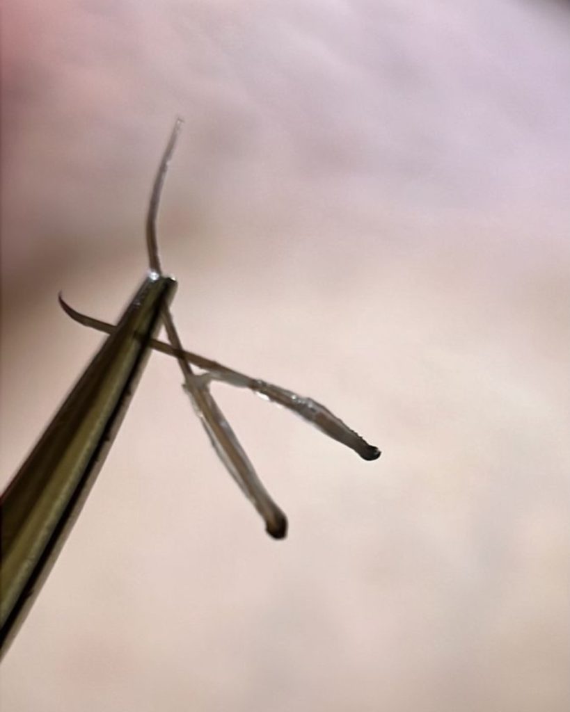 Un micro-filament à usage unique est inséré dans le follicule, puis une micro-impulsion agit à l’intérieur. Le poil est ensuite retiré sans résistance.