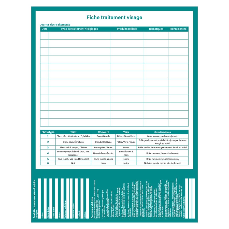 Besoin de simplifier le processus de prise de renseignements lors de rencontres avec votre clientèle? Nos fiches client sont là pour vous faciliter la vie! Vous y trouverez regroupées de manière logique et systématique l’ensemble des renseignements pertinents au traitement de chaque client(e). Chacune d’entre elles présente également un feuillet-conseil détachable que vous pourrez offrir afin d’encourager un suivi optimal des recommandations post-traitement. Version française.